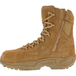 The Reebok Rapid Response is a field-proven tactical boot with advanced comfort technology and durability for modern first responders, law enforcement officers and military professionals. The leather and ballistic nylon upper is resilient enough for rugged terrain and urban landscapes. The EVA midsole, embedded Shock Eliminator heel cushion, and Foot Force F2A footbed work together to provide all-day cushioning and comfort. Meets ASTM F2413 safety standards and has an XTR extra wide composite toe cap. Metal free. Aggressive mountain trail rubber outsole. Style: RB8850.